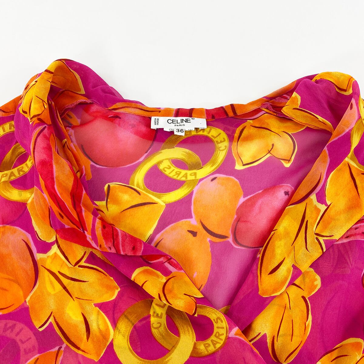★激レア/高級生地★ CELINE セリーヌ シルク100% トリオンフ ピンク花柄 ワンピース ブラウス ボウタイ 36 SMサイズ フランス製 クリーニング済み